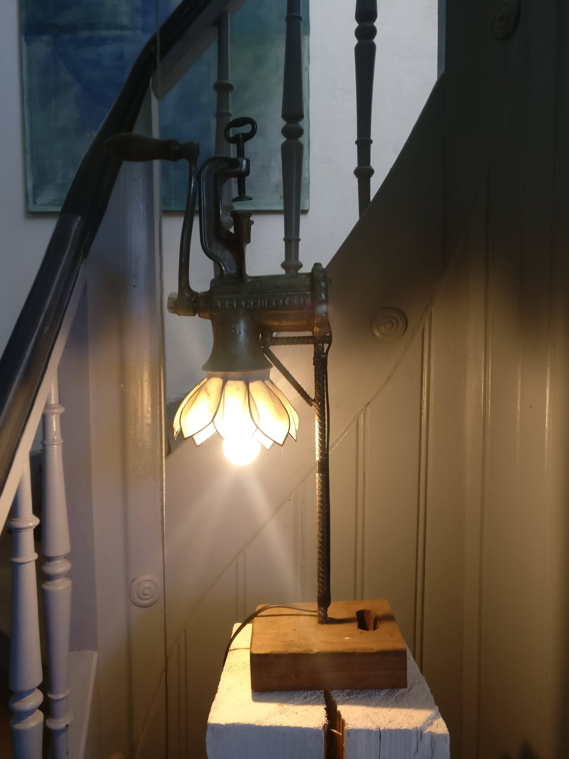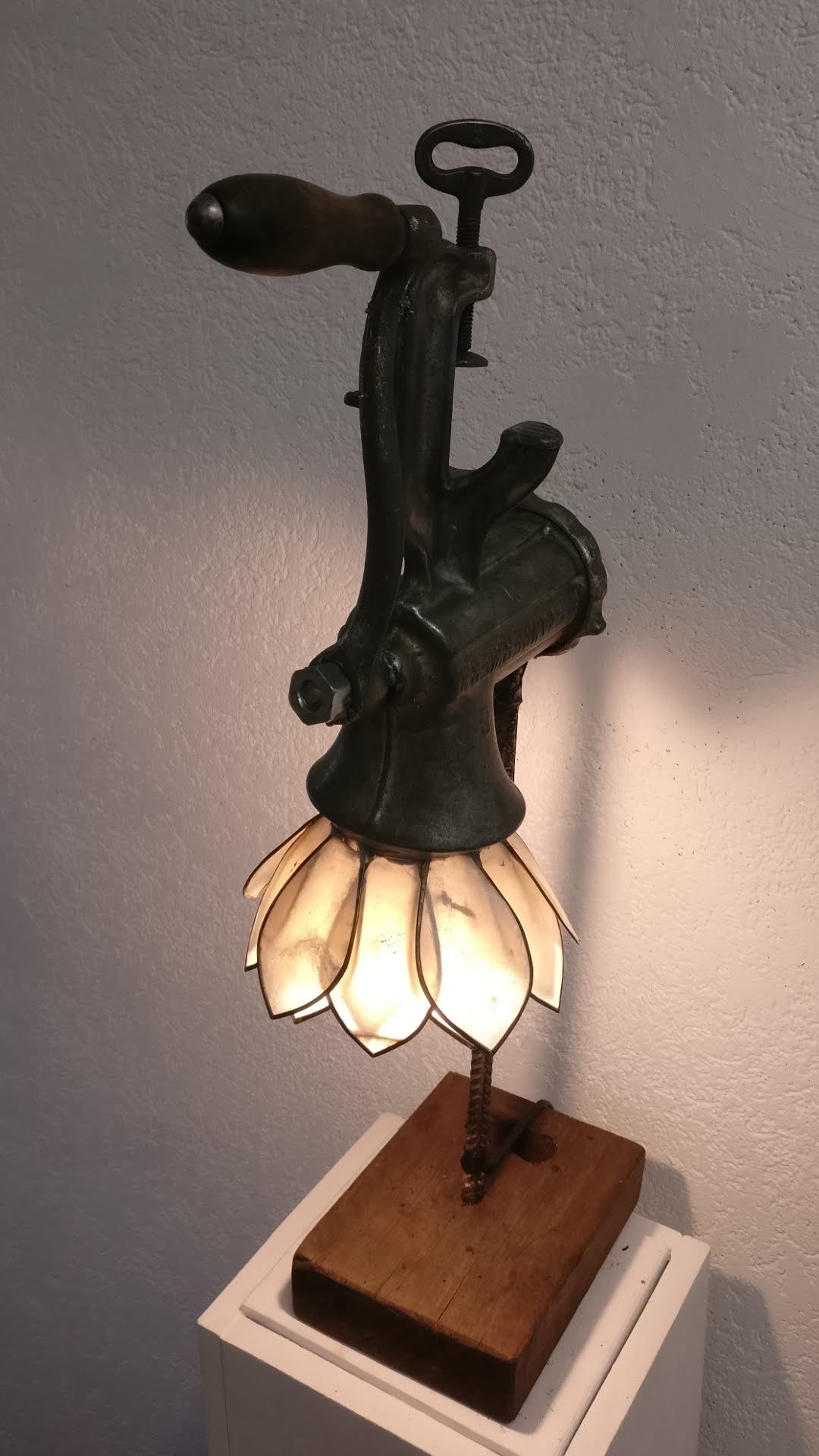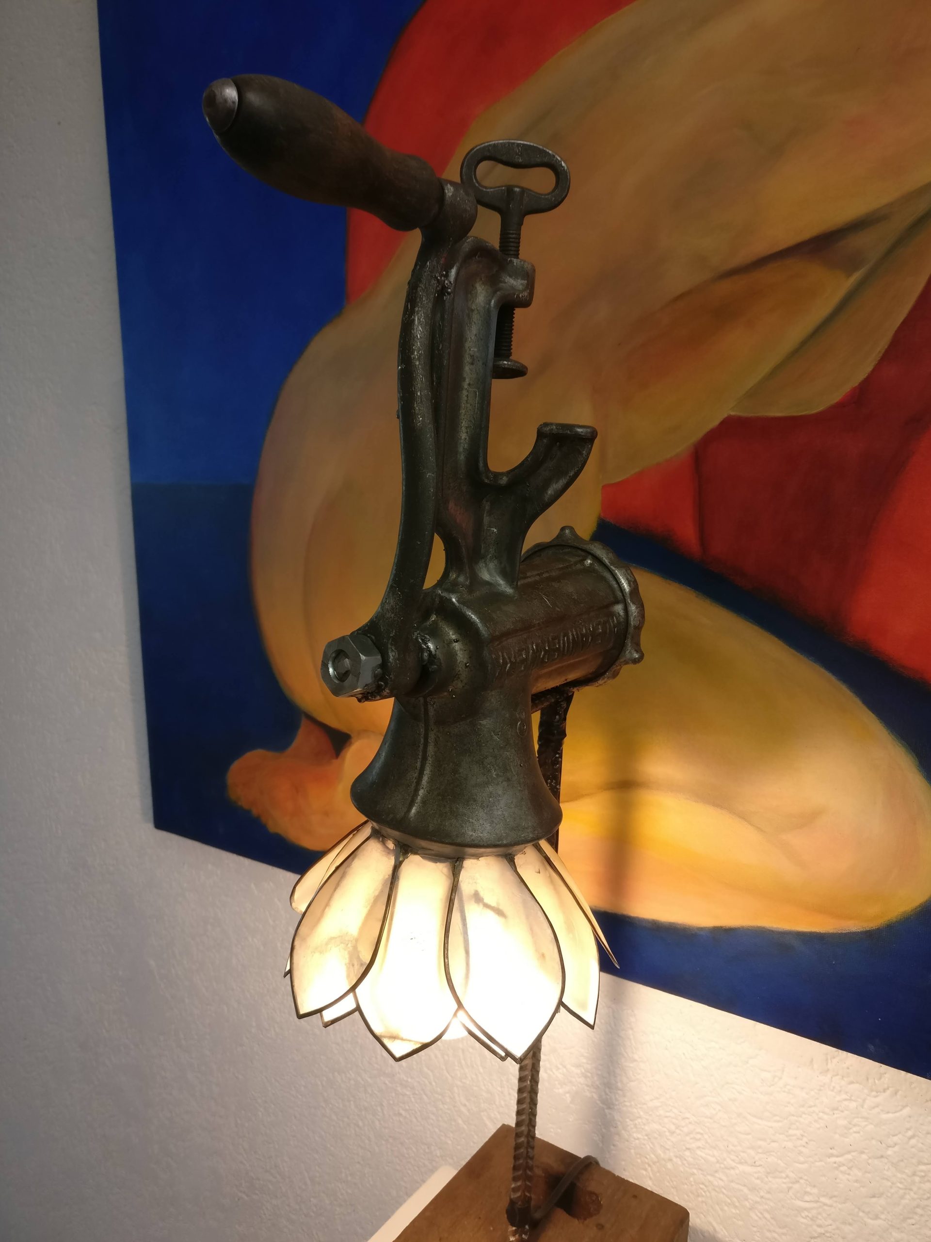 Eisen / Sockel Holz / Perlmutt Lampenschirm